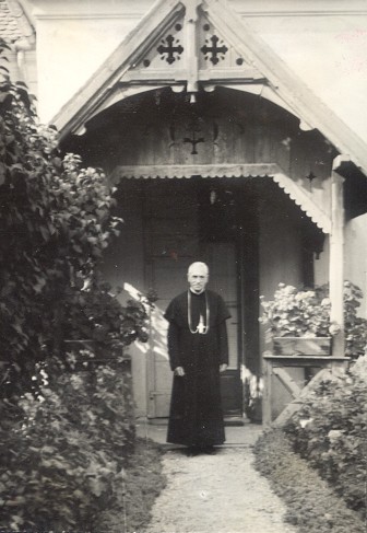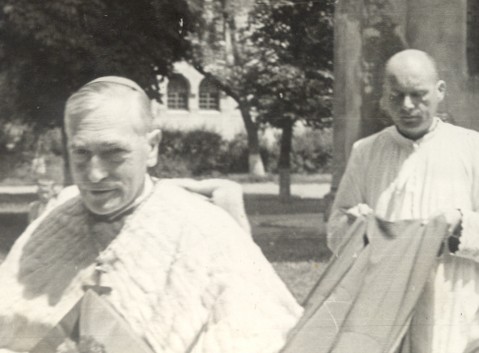 Püspöki öltözékben a kertben
