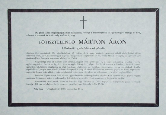 1980. október 4-én temették el Márton Áron a gyulafehérvári székesegyház kriptájába.